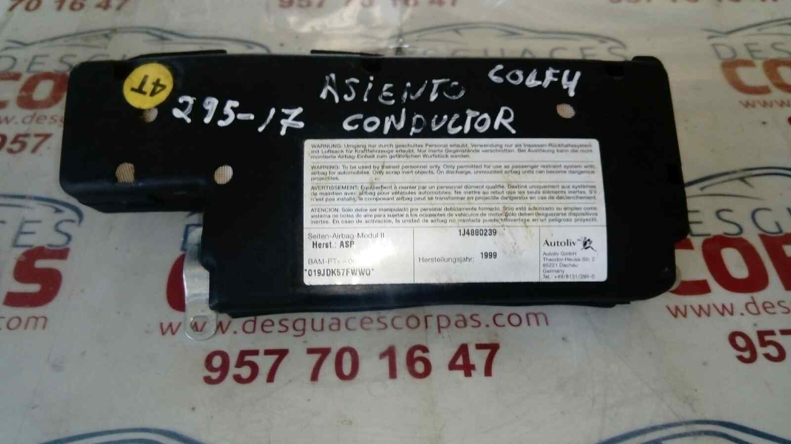 AIRBAG DELANTERO IZQUIERDO para VOLKSWAGEN GOLF IV BERLINA (1J1)(10.1997) con motor AKL.. Referencia: 1J4880239 – 00295-17 – AIRBAG ASIENTO DELANTERO IZQUIERDO. A?o de la pieza: 1999.
